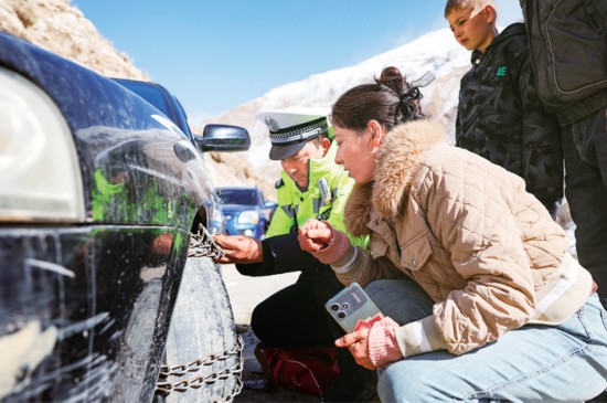 多年来,当学生寒暑假大规模返校和回家时,新疆叶城县都会组织党员干部带队,动员县、乡、村三级力量,用心用情守护上学路。图为2024年2月22日,在前往西合休乡中心小学翻越海拔4000多米的雪山途中,驾驶员和叶城县公安局交通管理大队工作人员一起为接送学生的车辆安装防滑链。 新华社记者 胡虎虎/摄